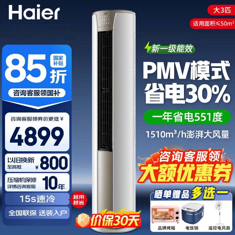 海尔(Haier)空调大3匹柜机 净省电小红花新一级能效全直流变频冷暖大风口家用自清洁WiFi智控客厅圆柱立式空调 静悦 大3匹 一级能效 一键PMV 省电30%
