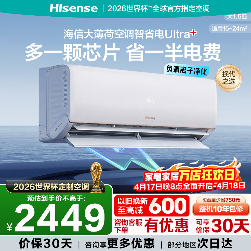 海信大薄荷智省电Ultra+ 世界杯指定空调 大1.5匹双排铜管 AI省电50%负氧离子净化挂机空调国家补贴15% 限时补贴 KFR-35GW/A330UPro-X1