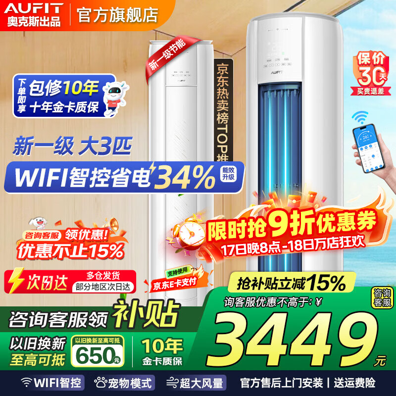 AUFIT空调奥克斯(AUX)出品 大3匹新一级变频冷暖立柜式空调大2匹 家电补贴 智控大风量省电自清洁空调 大3匹 一级能效【新品】智能大风量双排铜管