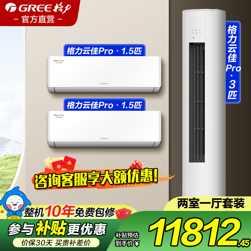格力空调1.5匹一级能效3匹国家补贴套装三室一厅 二室一厅 一室一厅云佳pro家用客厅卧室省电挂机柜机 二室一厅1.5匹*2+3匹【咨询客服有惊喜】 官方旗舰正品