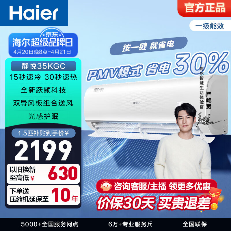 海尔(Haier)净省电空调1匹1.5匹挂机 新一级能效变频急速冷热净畅自清洁壁挂式 静悦卧室空调 家电以旧换新 静悦 一级能效 1.5匹 急速冷暖35KGC