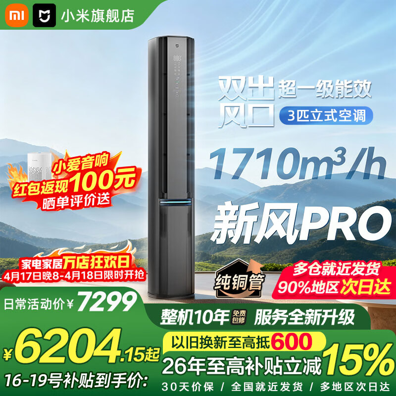 小米(MI)新风空调米家 3匹 超一级能效 新风Pro 人感双出风 变频冷暖 智能互联 圆柱健康立式柜机 3匹 超一级能效 新风Pro 星缎银