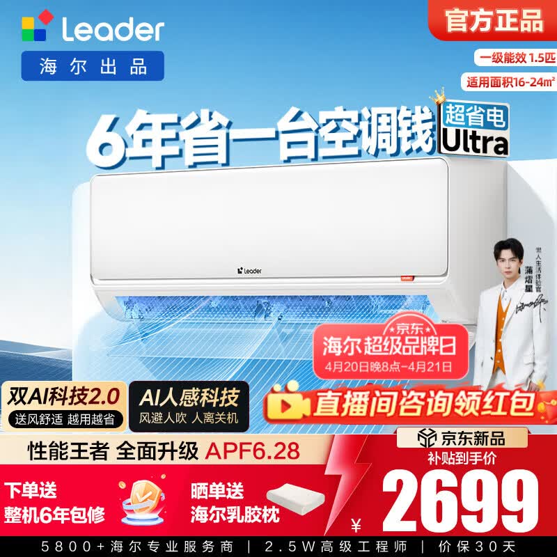 统帅(Leader)海尔智家出品 统帅空调挂机1匹1.5匹变频室内一级能效 冷暖两用双排铜管蒸发器超省电以旧换新补贴 超省电ultra 性能王者 AI人感 1.5匹 双AI系统