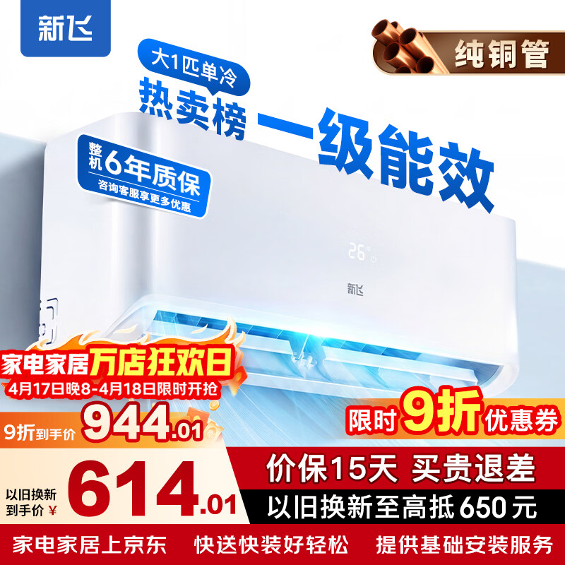 新飞空调 一级能效 大1.5匹大1匹空调挂机 纯铜管 以旧换新 静音省电冷暖变频单冷空调 家用壁挂式空调 单冷 大1匹 一级能效 含基础安装