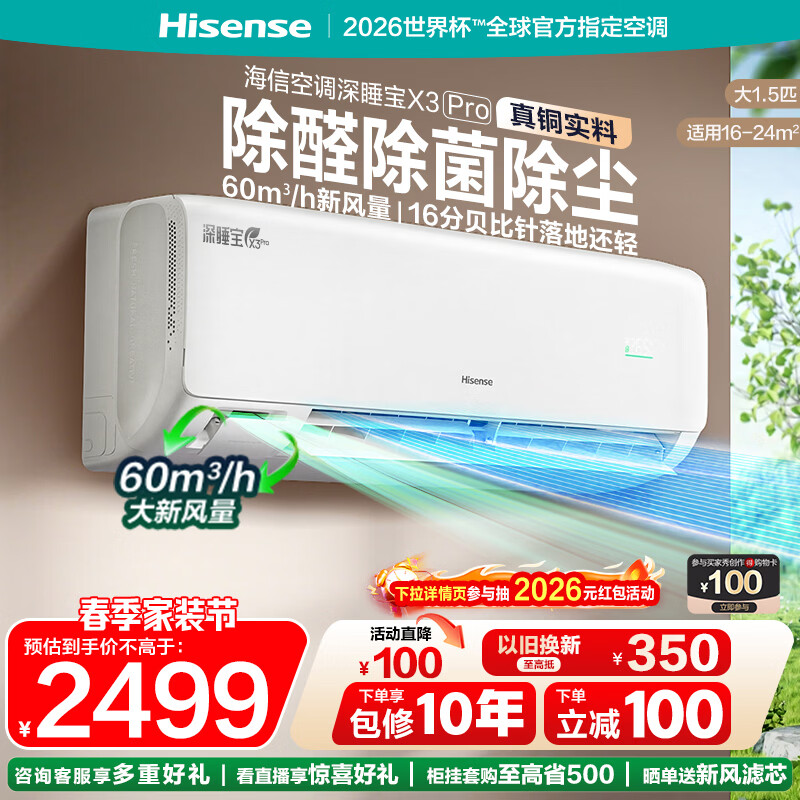 海信(Hisense)空调深睡宝X3Pro 大1.5匹 增氧新风 AI省电 新一级能效补贴20% 双排纯铜管 以旧换新 深睡眠挂机 KFR-35GW/X300Pro-X1