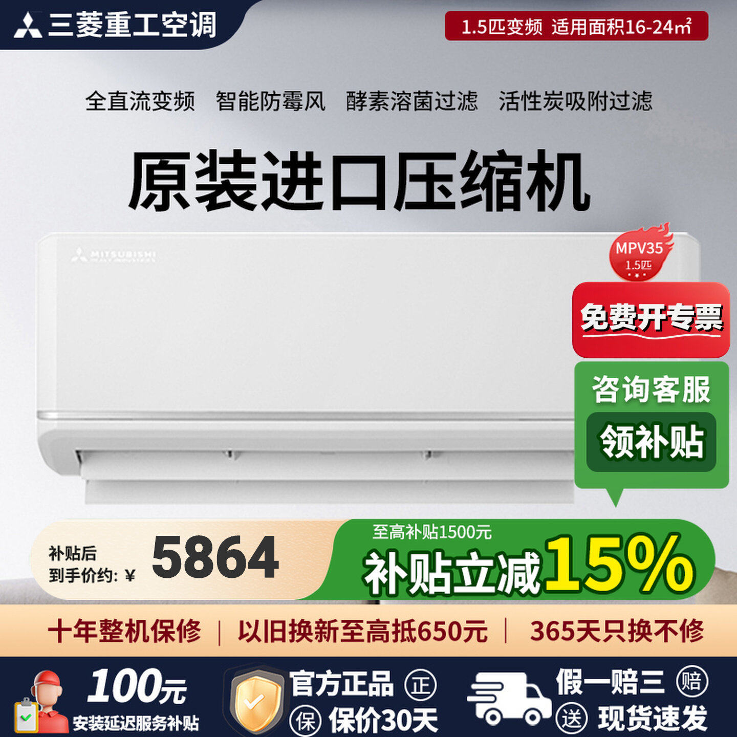 三菱重工空调家用1.5匹挂机变频卧室客厅冷暖两用空调官方正品MPV