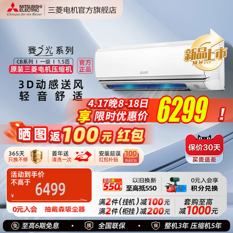 【新品】三菱电机空调MSZ-CB12VF变频1.5匹家用冷暖型挂机菱之光