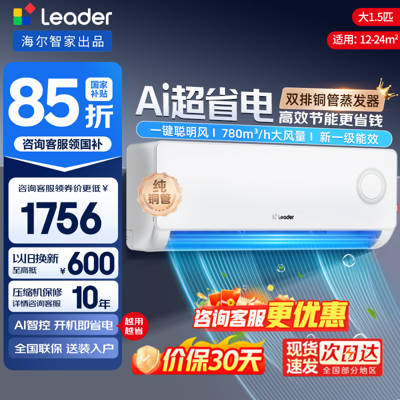海尔(Haier)空调出品大1.5匹挂机 超省电 变频冷暖壁挂式家用空调 卧室防直吹自清洁统帅空调挂机家电补贴 超省电 大1.5匹 一级能效 AI省电
