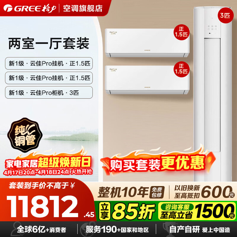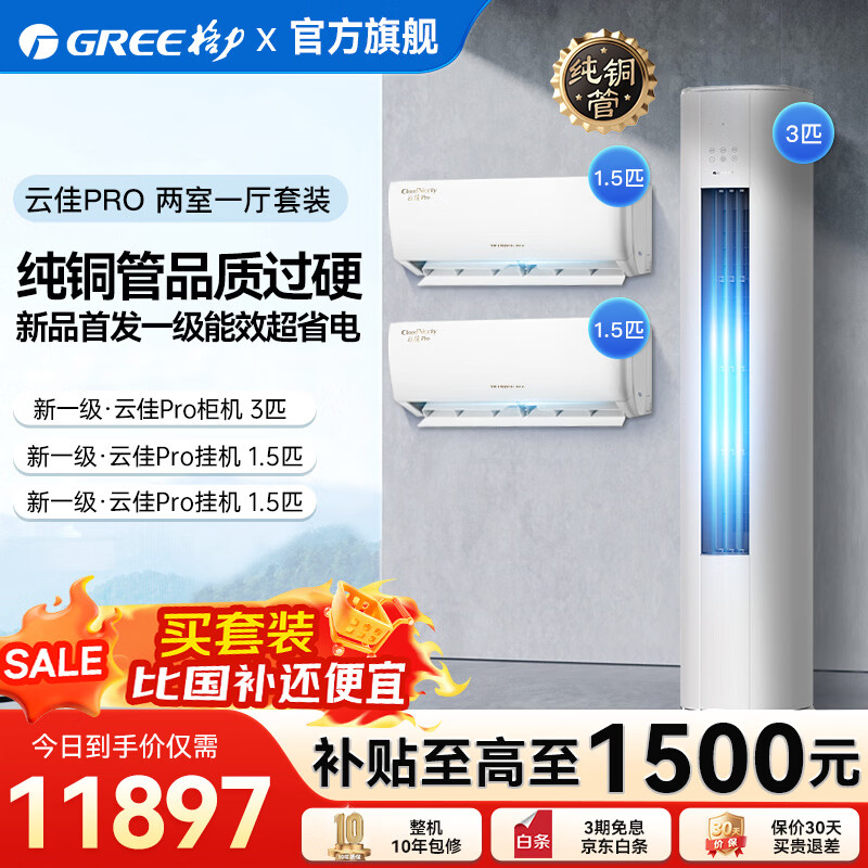 格力空调 云佳Pro套装/云佳云逸套装 【补贴】一级能效 节能省电 冷暖变频自清洁 家用柜机挂机套餐 【两室一厅】云佳Pro3匹+云佳Pro1.5匹*2