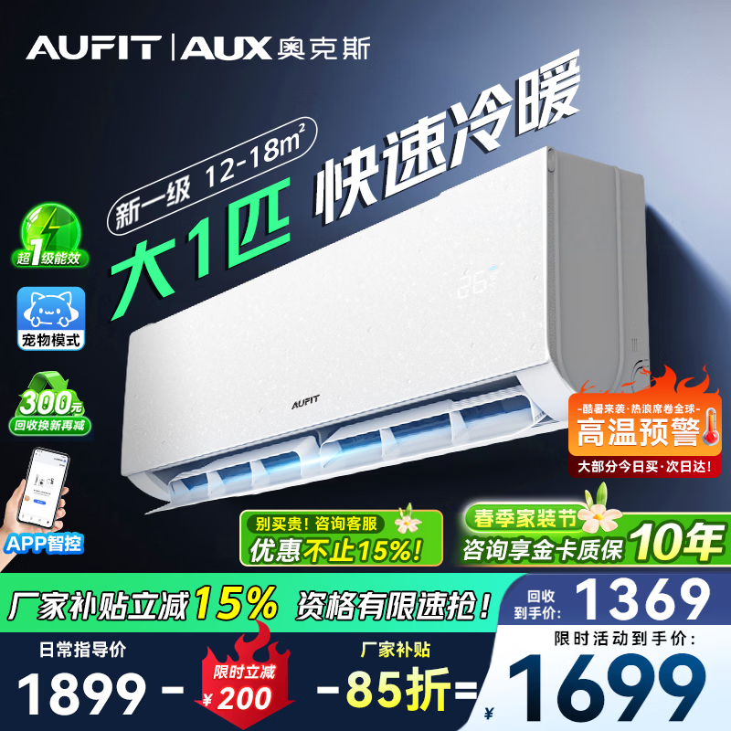 AUFIT空调奥克斯(AUX)出品大1.5匹挂机新一级能效变频冷暖家用卧室壁挂式防直吹除菌自清洁换新国家补贴 超省电max 大1匹 一级能效防直吹【WIFi款】