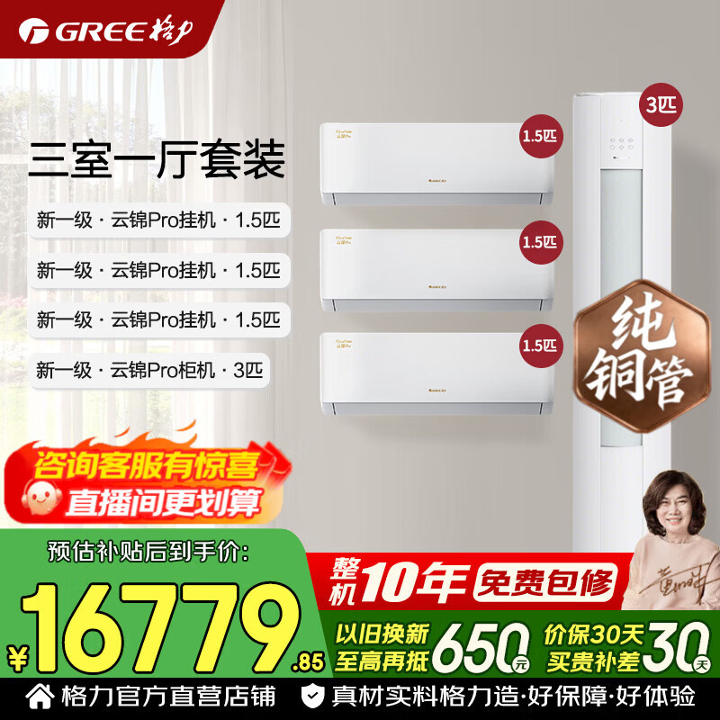 格力空调套装 云锦pro/云锦三代升级款 新一级能效 变频冷暖 纯铜管 客厅立式柜挂套装 家电国家补贴 【三室一厅】云锦Pro 1.5匹*3+3匹*1