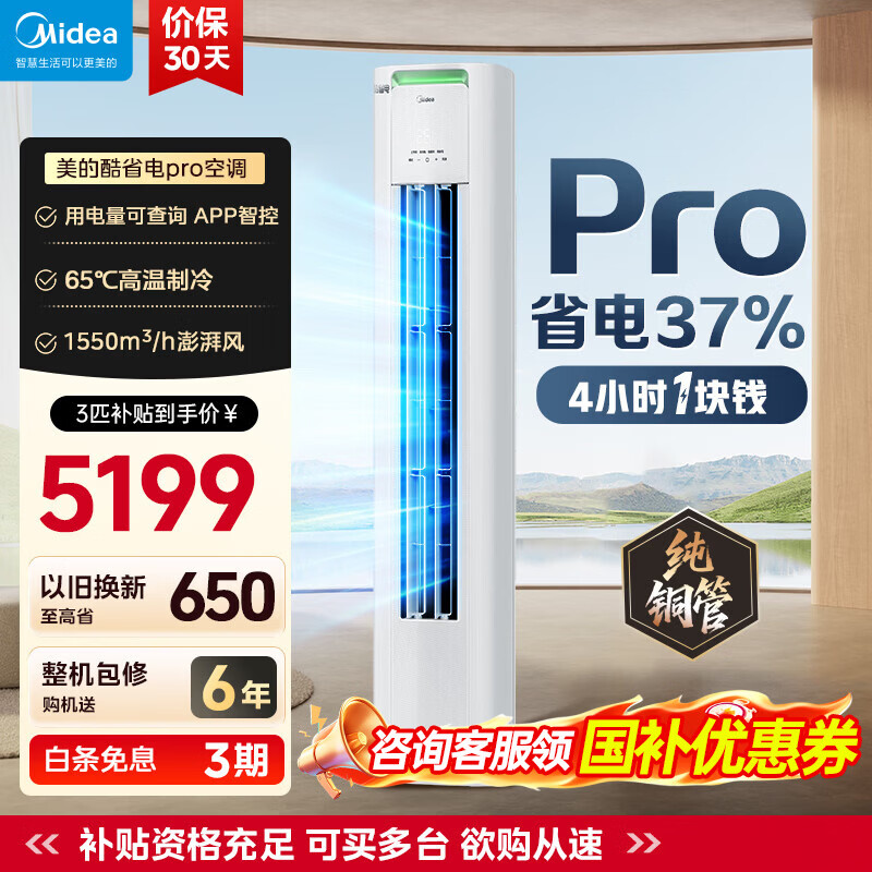 美的(Midea)酷省电二代大3匹 新一级能效PRO变频冷暖 空调柜机立式独立除湿 26年升级新款 国家补贴 以旧换新 酷省电 大3匹 一级能效 酷省电PRO柜机