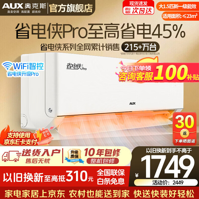奥克斯(AUX)空调1.5匹挂机 自清洁 变频速冷暖 低噪节能 以旧换新 壁挂式家用节能 省电侠Pro 大1.5匹 一级能效省电45%手机智控