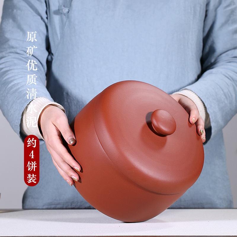 紫来顺 宜兴紫砂茶叶罐 陶瓷密封罐家用大小号普洱茶缸包装盒 4饼 清水泥