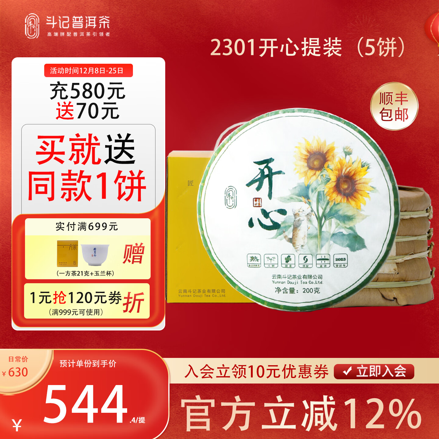 斗记普洱茶2301开心熟普甜柔春茶叶云南饼茶拼配茶茶叶自己喝茶叶送礼 (提装)200克*5饼