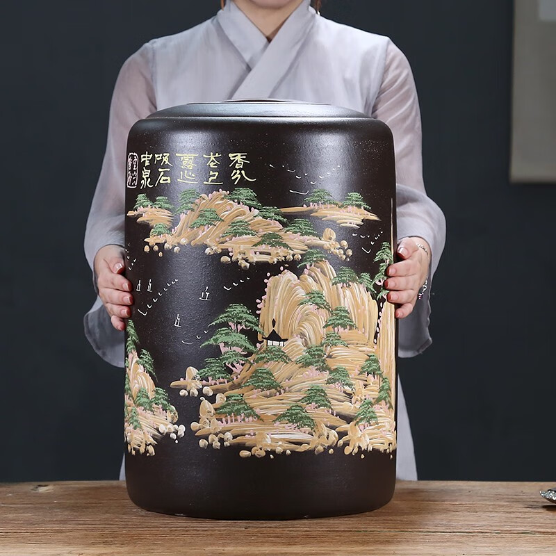 紫来顺 紫砂茶叶罐大号大容量家用普洱茶饼罐陶瓷存茶罐带盖密封罐储茶醒茶罐 粉浆黑泥-28饼