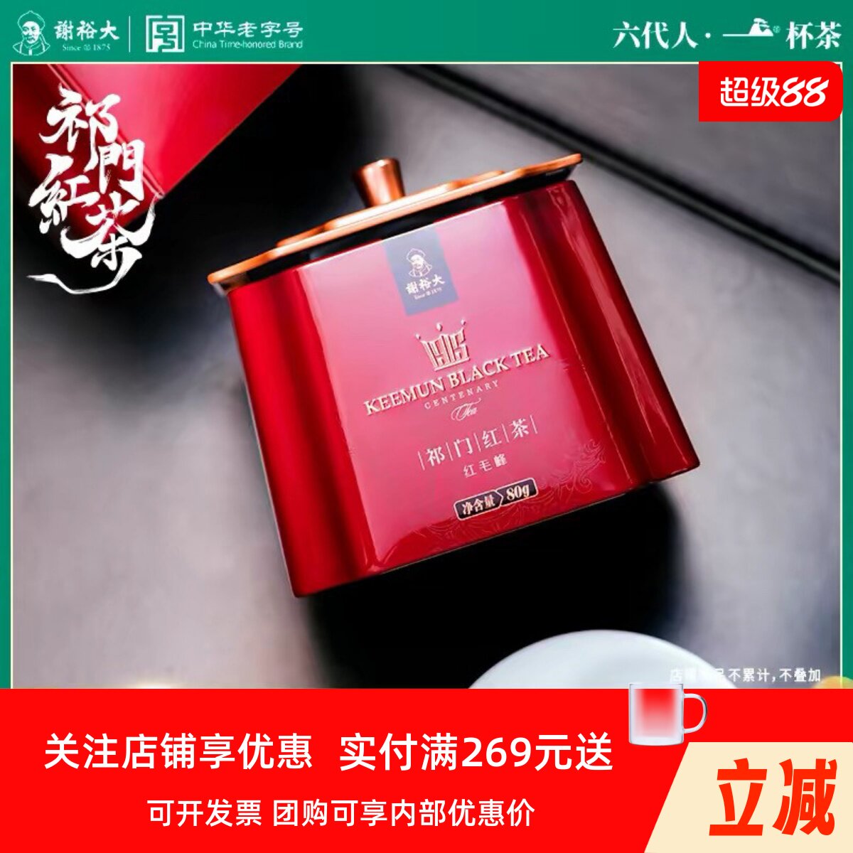 谢裕大祁门红茶特级茶叶祁红毛峰红顶2000罐装80g自饮待客