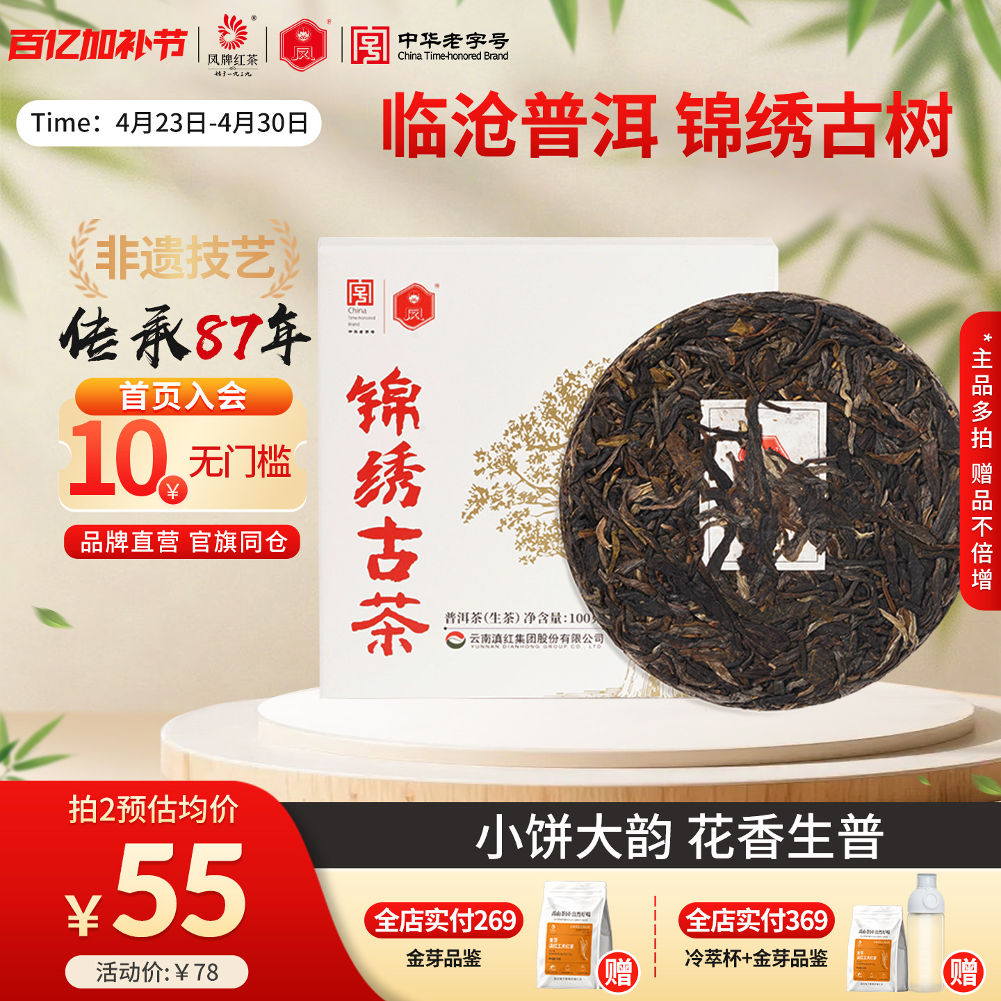 凤牌普洱云南正宗高山临沧普洱锦绣古茶普洱茶生茶100g茶饼老字号