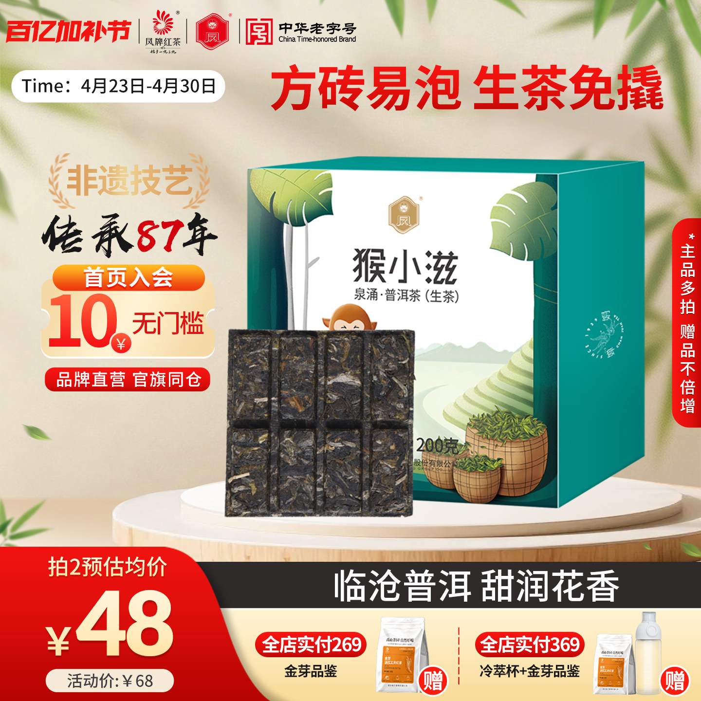 凤牌茶叶老字号云南普洱茶生普茶砖陈香耐泡免撬200g一块一泡便携
