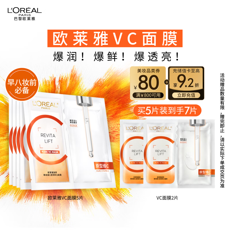 欧莱雅复颜VC面膜补水5片维C玻尿酸保湿抗皱提亮护肤品圣诞礼物