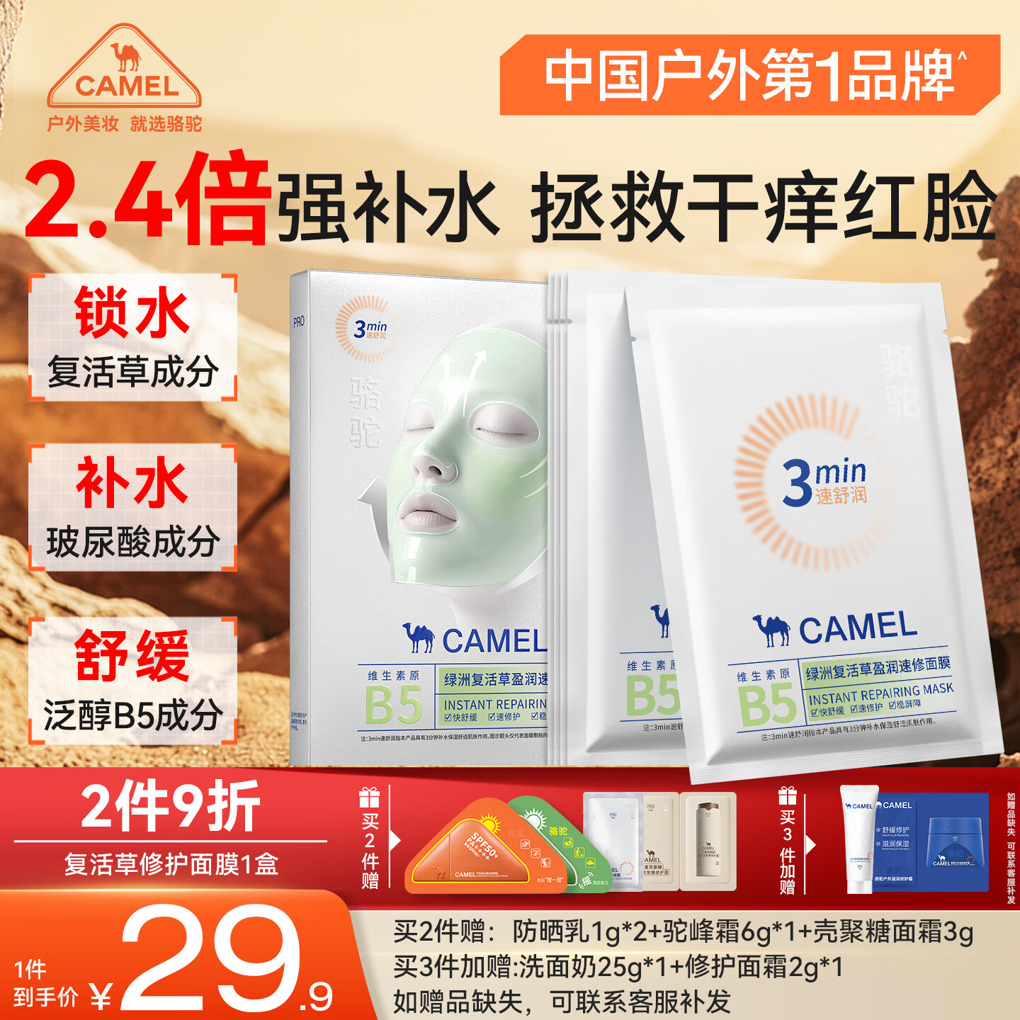 骆驼(CAMEL)复活草修护面膜5片 补水保湿清洁睡眠面膜女神节礼物秋冬湿敷棉男