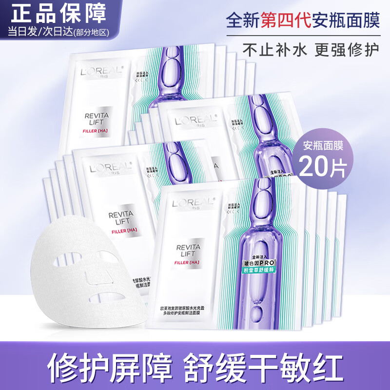 欧莱雅面膜女玻尿酸安瓶面膜补水积雪草保湿淡纹抗皱紧致修护舒缓护肤品 安瓶玻尿酸面膜*20片 4.0版