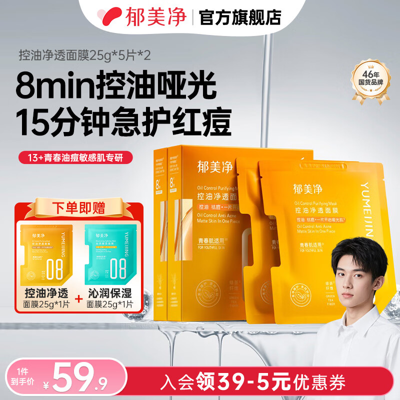 郁美净青少年补水保湿面膜舒缓痘痘泛红13-18岁男女生适用 控油净透面膜25g*5片*2