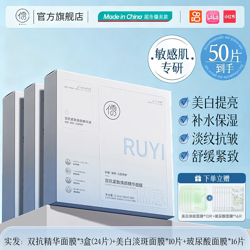 儒意双抗精华面膜补水保湿抗皱紧致抗衰老美白淡斑去黄提亮淡纹女 50片/盒 【黄脸救星 抗氧提亮】