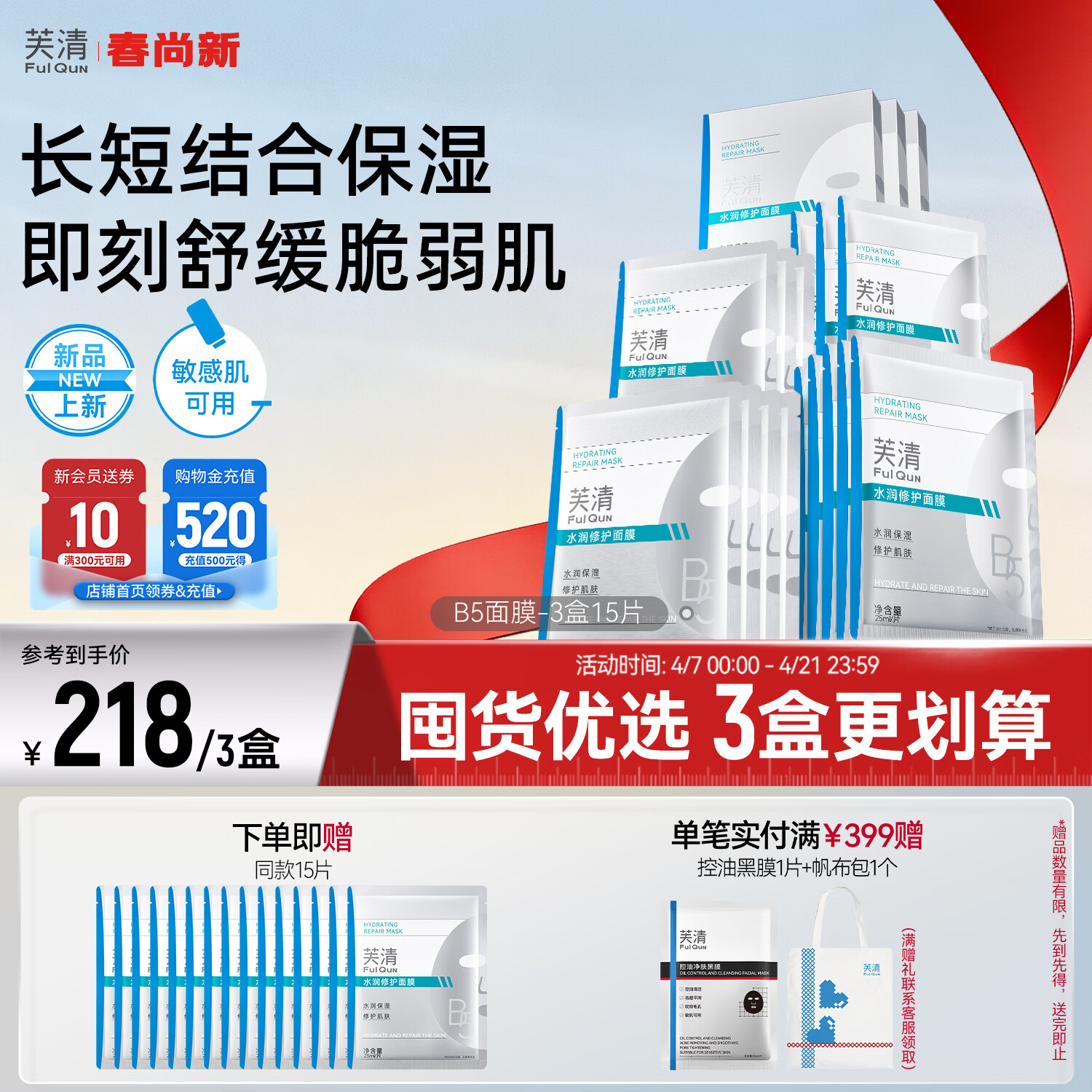 芙清B5水润修护面膜巨补水强修护舒缓温和适用于敏感干燥晒后肌肤 B5水润修护面膜【3盒】(15片)
