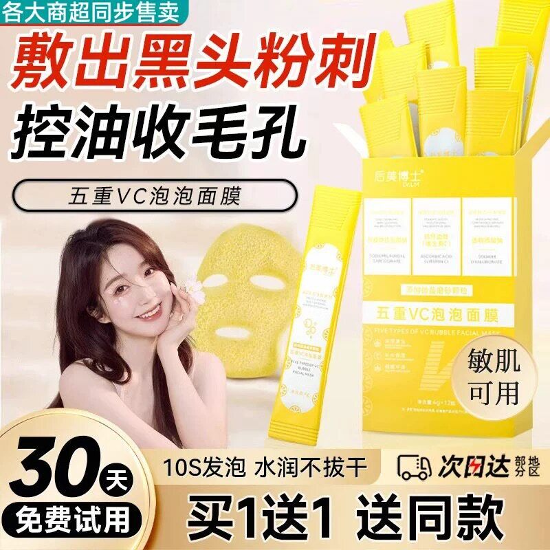 【89元5盒】深层清洁收缩毛黑孔头平闭口泥膜正品五重VC泡泡面膜