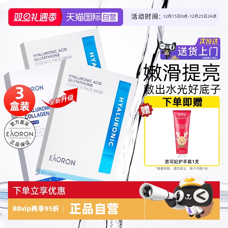 【自营】eaoron澳容玻尿酸胶原蛋白水光白面膜3盒补水保湿焕提亮