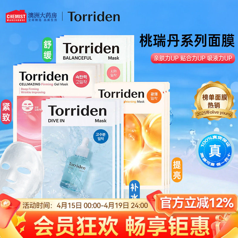 Torriden桃瑞丹玻尿酸补水贴片面膜积雪草修护胶原蛋白提亮紧致