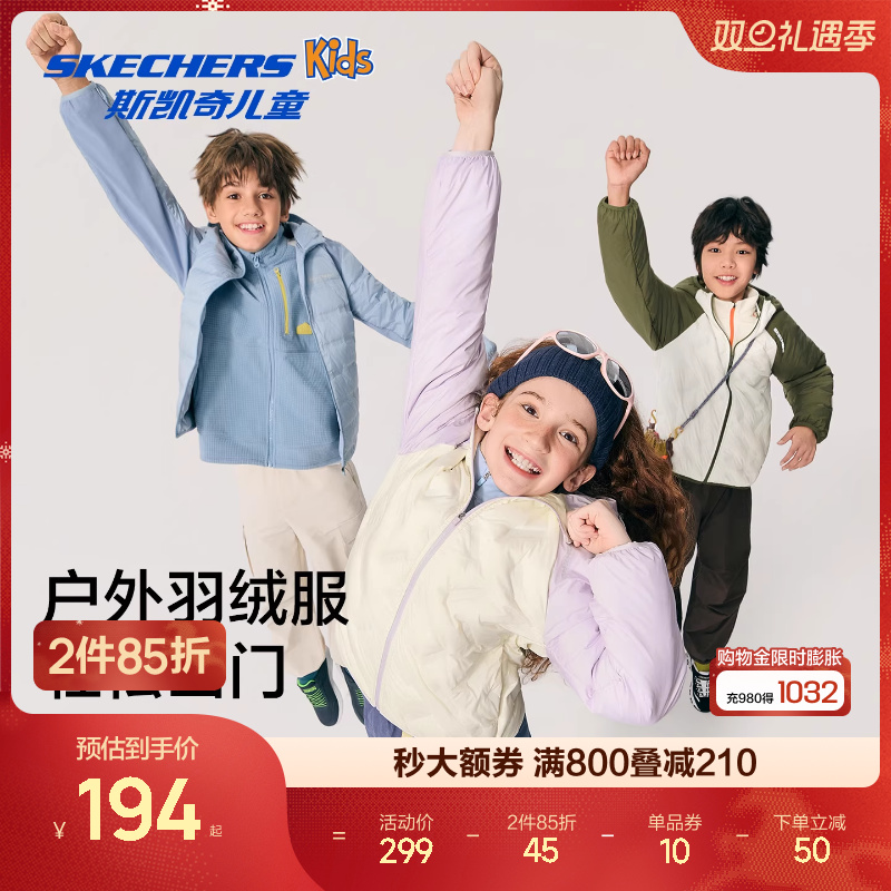Skechers斯凯奇儿童连帽羽绒服冬季时尚插肩袖男女童保暖羽绒外套