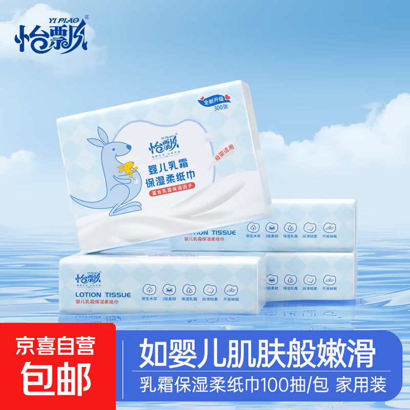 怡飘袋鼠乳霜纸3层300张云柔巾宝宝用纸柔纸巾柔润婴儿纸巾抽纸 家庭装3层100抽*4包