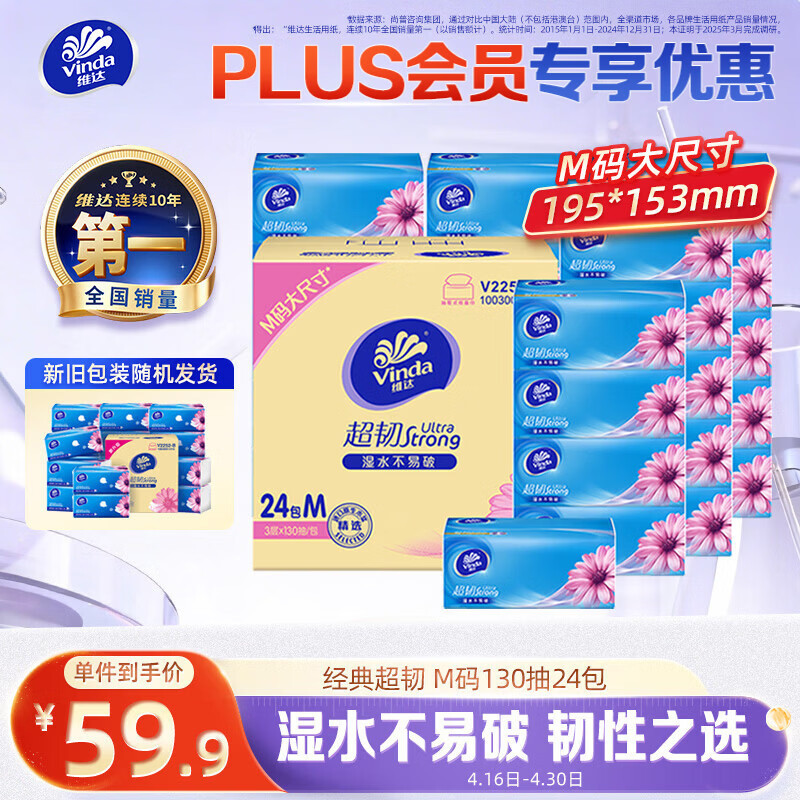 维达(Vinda)抽纸 【孙颖莎推荐】超韧3层130抽*24包M码 新旧随机 整箱