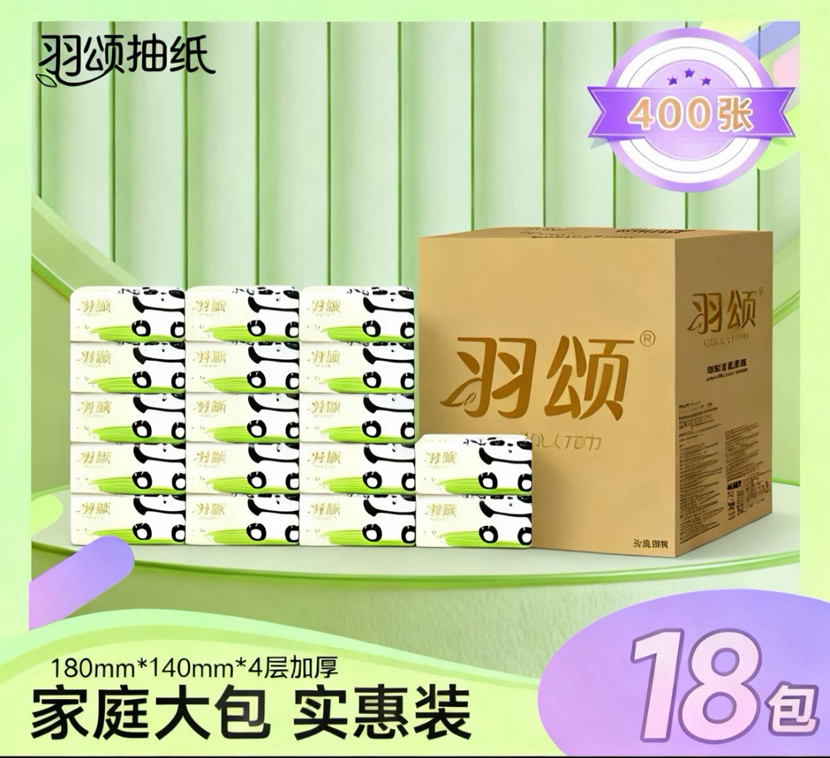 羽颂家用抽纸100抽4层大包厕所卫生纸便携餐巾纸实惠装整箱18包